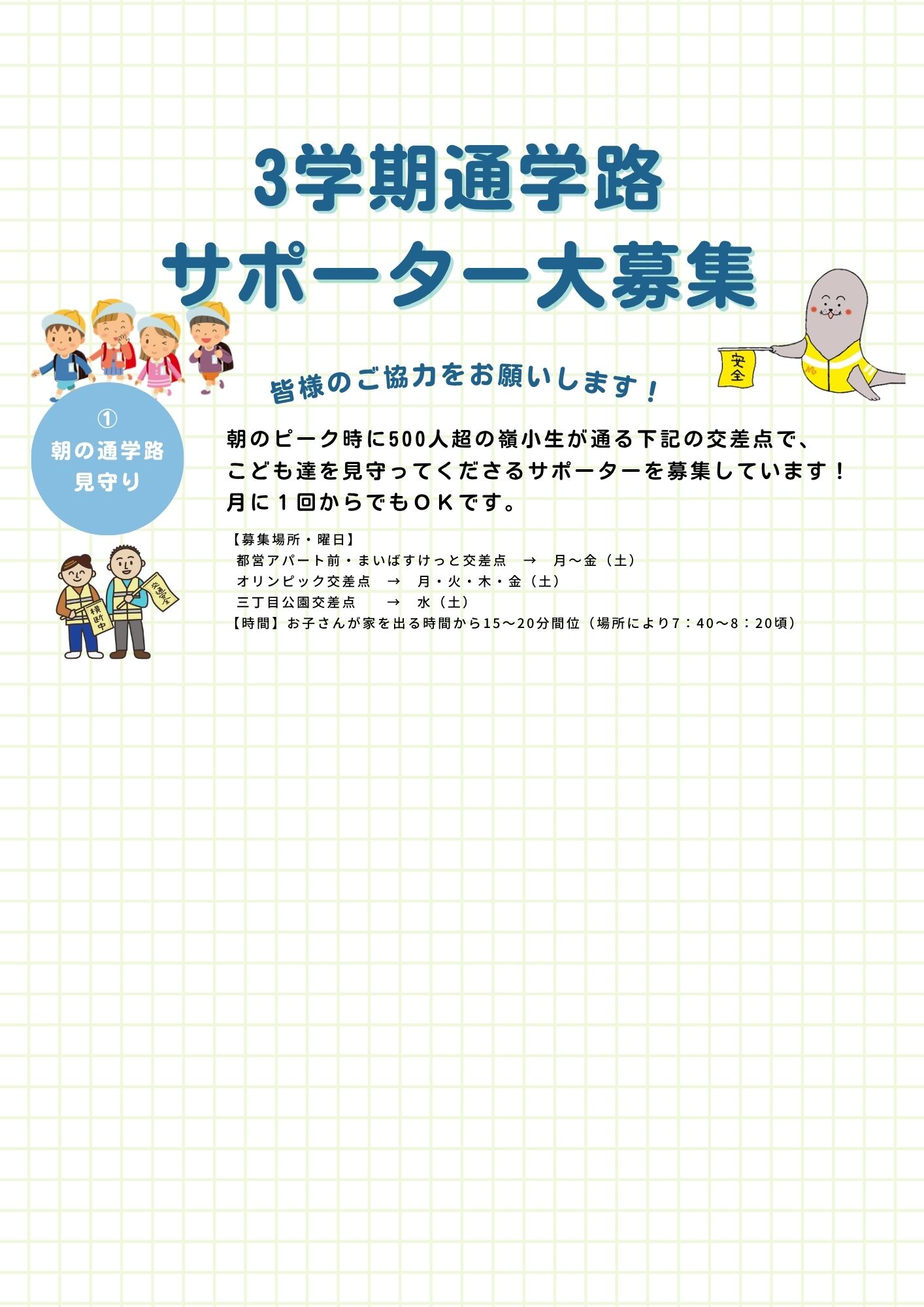 本フォームで入力頂いた個人情報は、朝の見守りサポーター活動にのみ利用され、年度末をもって情報は消去されます。