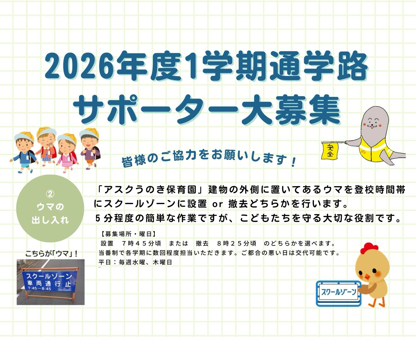 本フォームで入力頂いた個人情報は、朝の見守りサポーター活動にのみ利用され、年度末をもって情報は消去されます。
