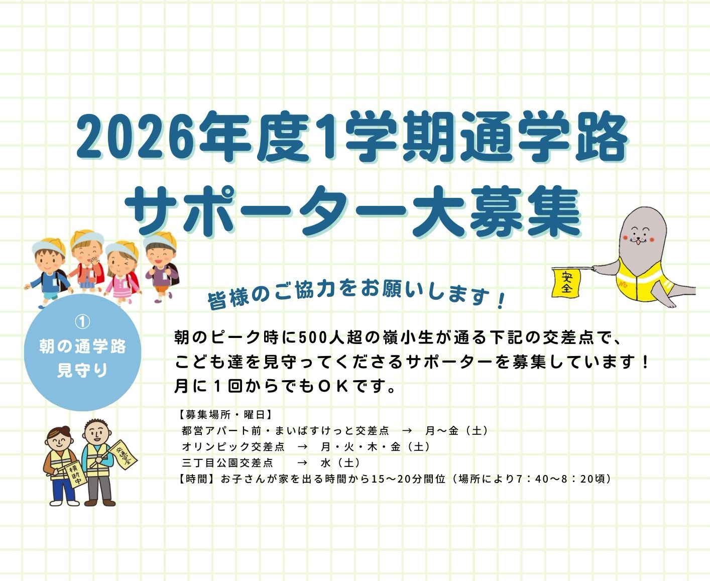 本フォームで入力頂いた個人情報は、朝の見守りサポーター活動にのみ利用され、年度末をもって情報は消去されます。